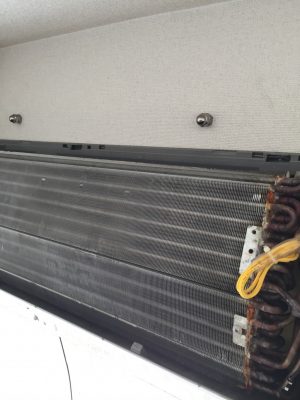洗浄前の熱交換器です、全体的にカビとホコリで汚れています。