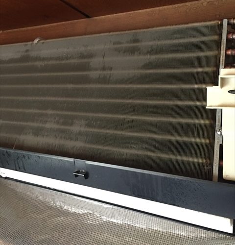 熱交換器の目の奥までカビと埃が詰まってます、エコ洗剤のJH-1と高圧洗浄で洗っていきます。このファンからカビとホコリが室内にまき散らされます。洗浄後の熱交換器です、実物見るととても綺麗になっているのですが写真だとイマイチです。