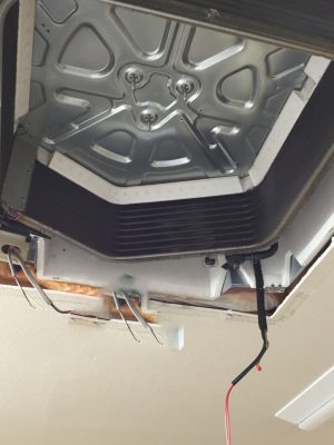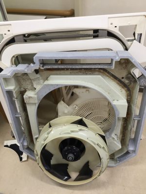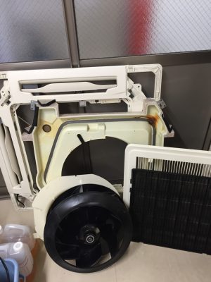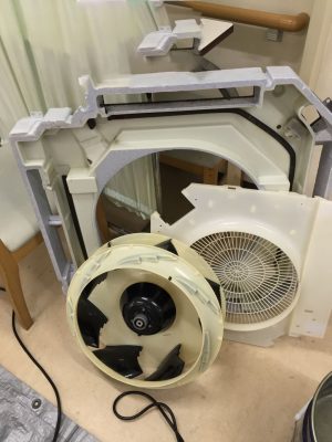 基盤が外れればドレンパン降ろしてファン、モーターの順に降ろして洗浄カバー装着します。