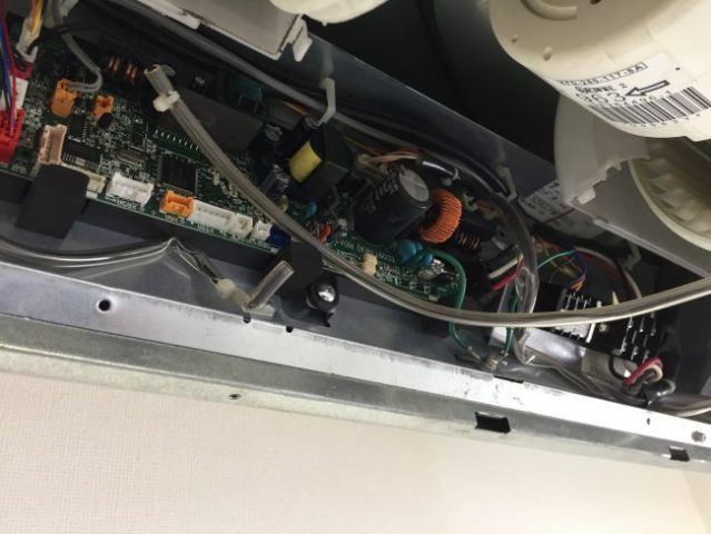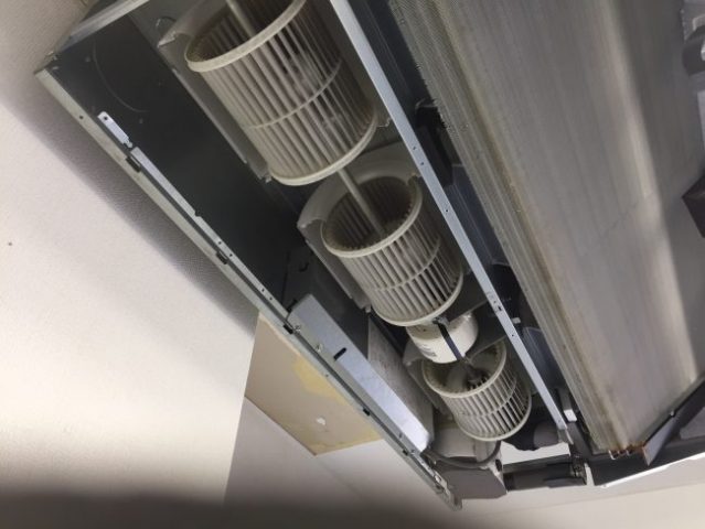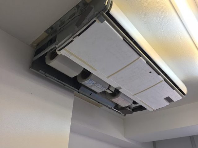 三菱製とダイキン製の天吊り1方向でどちらも同じ大型サイズです、横幅が2メートル超えなので私が両手を広げても届きませんので、この背面パネルを留めてる1番最後のネジを取る瞬間この大きな鉄板のパネルが落ちてくるのでまぁ怖いです。