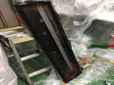 厨房設置のため熱交換機が油で覆われています、これでは冷えません。油汚れで真っ黒な汚水が出て来ます。