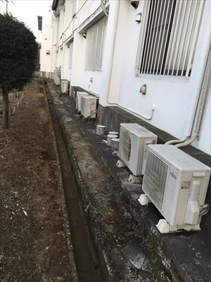 建物の北側に有る室外機はカビと苔が付着しています、このままカビと苔で覆われてしまうと熱交換ができず冷暖房の効きが極端に悪くなり故障に繋がります。