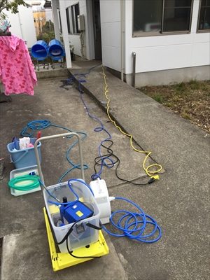ルームエアコンの室外機が並んでいます、延長ホースセットしてバシバシ洗えるので効率が良いです。