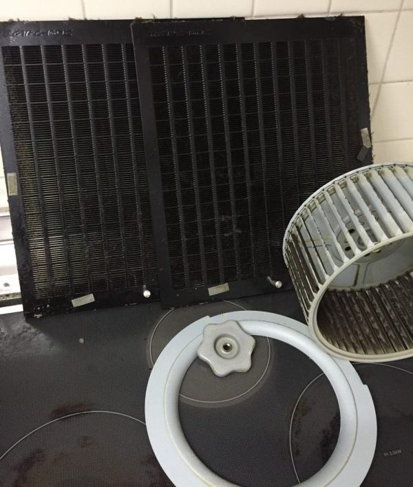 レンジフードの中の油汚れもクリーニングして、綺麗になったファンやフィルター装着して終了です。