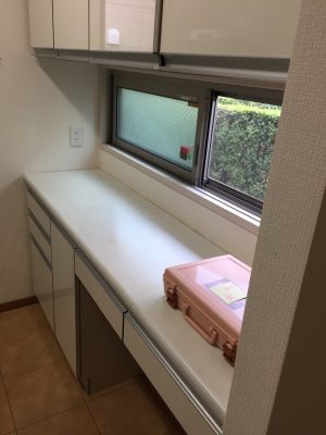 シンクも綺麗に水垢落ちました、レンジフードも組み戻し、IHのテーブル、全ての棚から扉、物入れの奥まで吹き上げたらキッチン終了です。