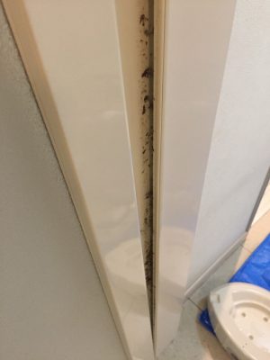 浴室ドアの下はカビ汚れが酷かったです。先に洗った洗い場の床が真っ白なのでカビ汚れが写真映えします!