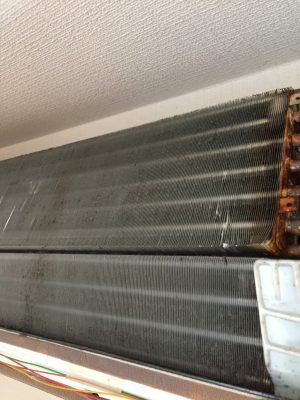 うっすらとホコリとカビが覆っている熱交換器、顔近づけるとかび臭い匂いがします。