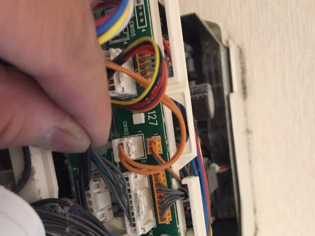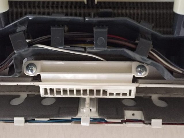 基盤がある右側です、銀色のカバー外すとこのエアコンの司令塔である電装基盤が触れます。お掃除機能の脱着にはここから4本プラグ抜く必要がありますが、覚えておく必要もない程シンプルになりました。