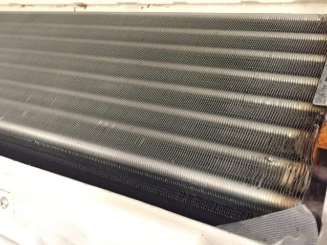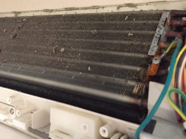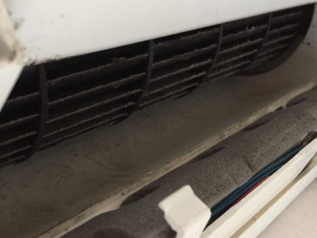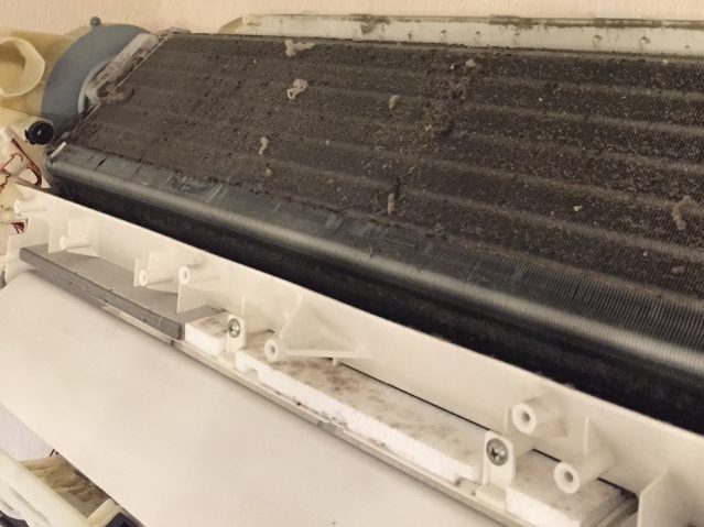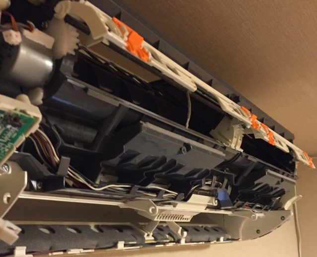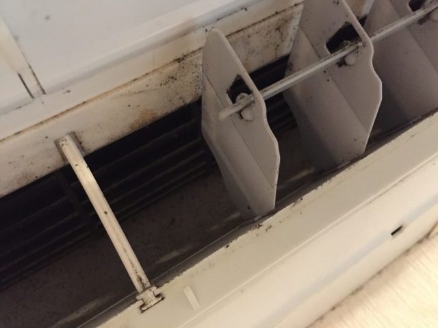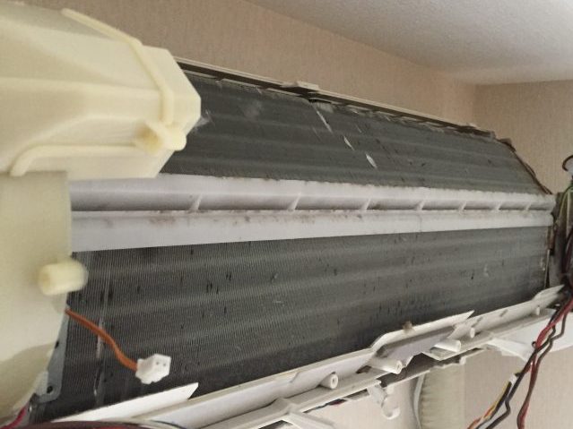 お掃除機能が外れました、見事にカビと埃で覆われた熱交換器が現れます。