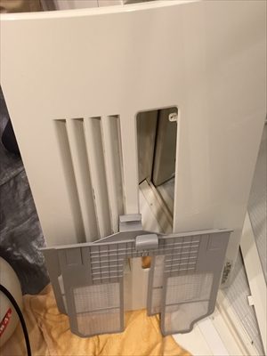 お掃除機能で取ったホコリをこの排気ファン(掃除機とも)で室外に出しますが、なかなか設計どうりにうまく排出できず、溜まった埃をエアコン内部に撒き散らしている状態のモノが多数あります。この中もよく確認して埃が溜まっていれば分解して掃除します。