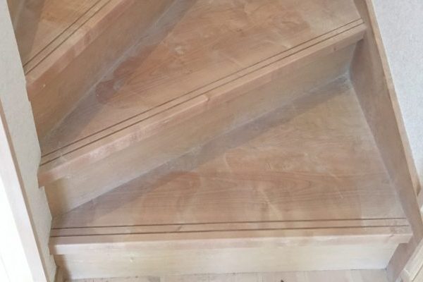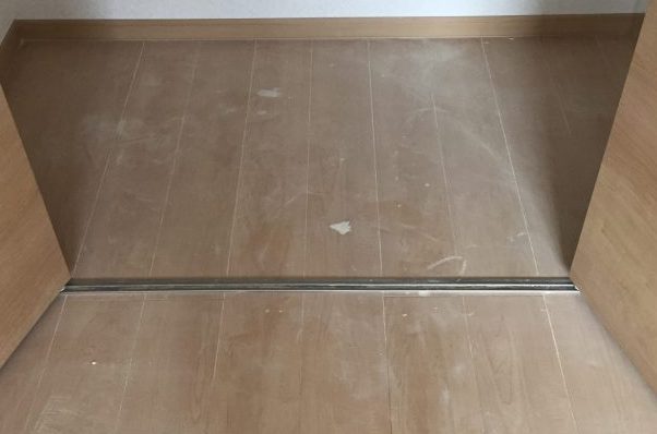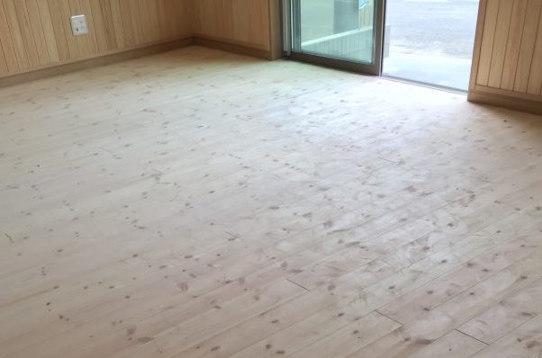 1階リビングの無垢床です、木くずとホコリで汚れています。