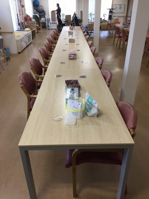 数日前に現調させて頂き今日が本番です、かなりの床面積とリハビリ-用の運動具やテーブル、椅子などが多く2名で施工するので時間内に仕上がるかちょっと心配ですが、二人で持てない重さのモノは基本移動させないので大丈夫でしょう、早速取り掛かります。